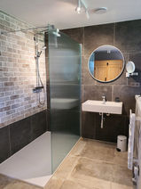 Une salle de bain spacieuse avec douche pluie, lavabo, sèche-cheveux, produits de toilette de luxe et toilettes séparées.